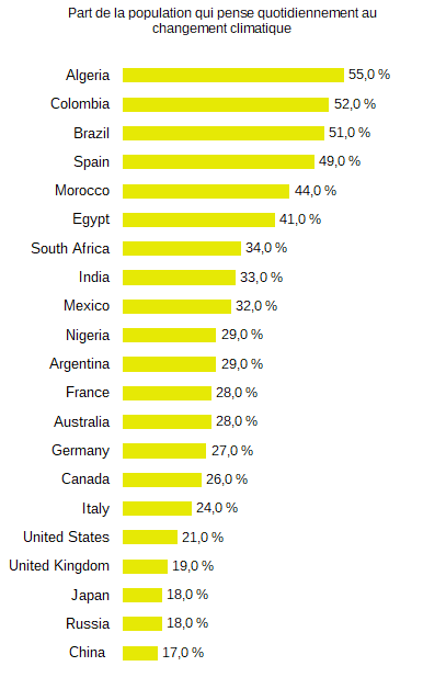 According to the United Nations Development Programme’s People’s Climate Vote 2024 survey, 32.5% of people worldwide say they think about climate change every day, and 23.5% think about it on a weekly basis. Only 11% say they never think about climate change.